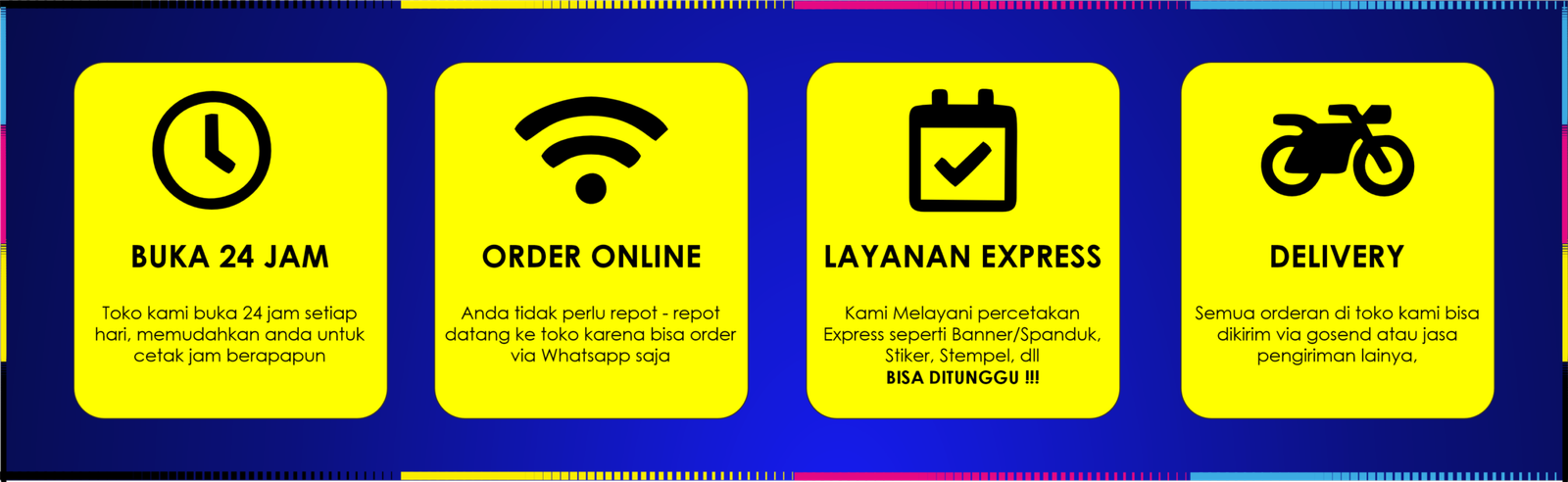 Mencari percetakan yang buka 24 jam sangat krusial untuk kebutuhan mendadak seperti tugas kuliah, proposal bisnis, atau spanduk acara. Di wilayah Bekasi dan sekitarnya? Express Printing hadir dengan pelayan 24 jam yang memudahkan customer untuk order kapanpun. Layanan yang kami sediakan sebagai berikut : Cetak Spanduk, Cetak banner, stiker, flyer, hingga fotocopy dan penjilidan Keunggulan, Hasil Cetak yang memuaskan, harga yang murah dan kami Benar-benar beroperasi 24 jam dan menerima pesanan online/WhatsApp
